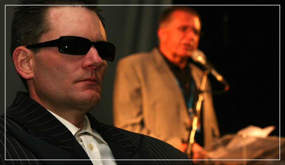 Die Gentlemen schlüpfen in die Rolle übertrieben ernster „Security-Mitarbeiter“ – mit Sonnenbrille, übertriebendem Ernst und einem Hauch Selbstironie.